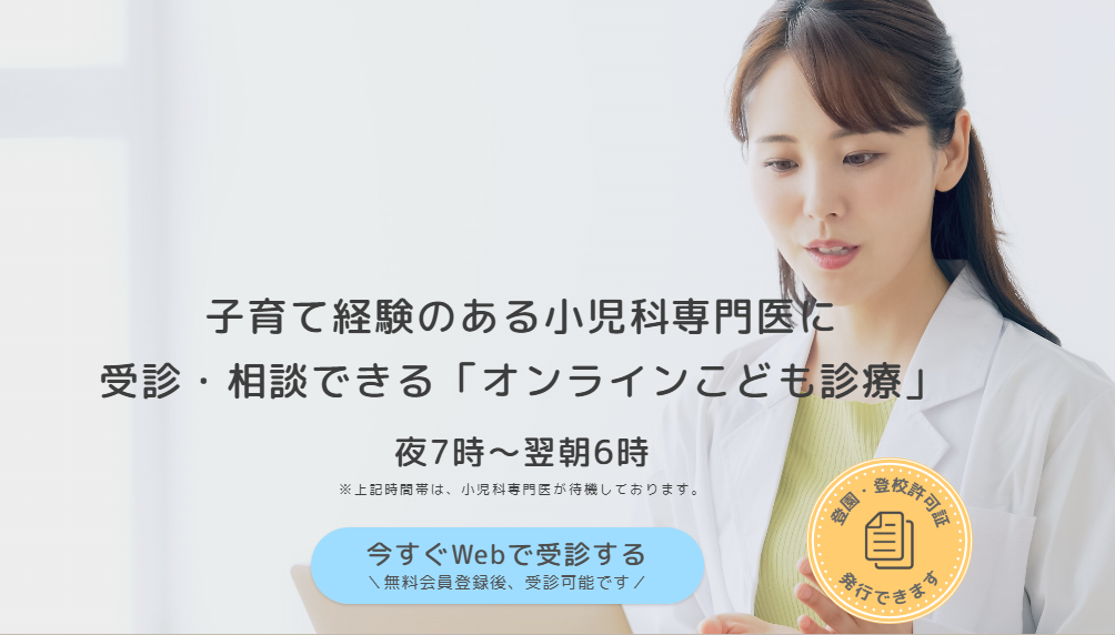 診察は健康保険・子ども医療費助成が適用され、診察費以外のサービス利用料はかかりません。また看護師へのチャット健康相談機能もあり、症状の聞き取りや受診の目安相談ができます。夜間・早朝・休日の診療にも対応しており、通院が難しい状況でも自宅で受診できる安心感が特長です。
